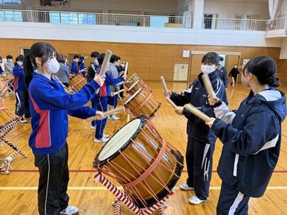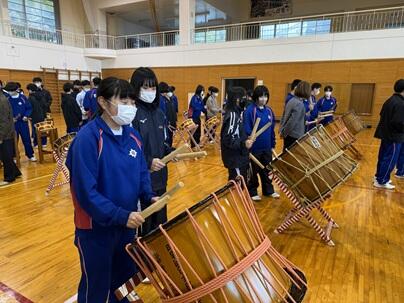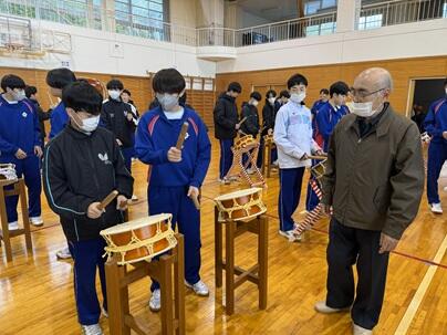 昨日27日(木曜日)5時間目、3人の講師の先生方にも来校いただき、3年生から2年生への御嶽太鼓伝承会が行われました。