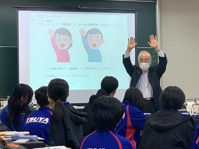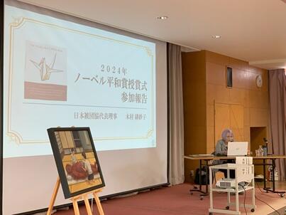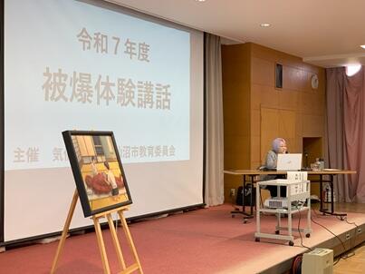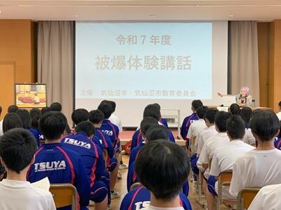 5、6校時、気仙沼市役所総務課主催で、2024年ノーベル平和賞を受賞した日本原水爆被害者団体協議会(日本被団協)宮城県原爆被害者の会(宮城県はぎの会)の木村緋紗子さんをお迎えして、被爆体験講話を聴きました。
