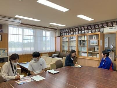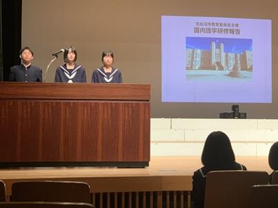 代表生徒が4名が地域連携室から津谷中学校の総合的な学習の時間(向が丘楽習)の取組や個人探究の発表を行いました。