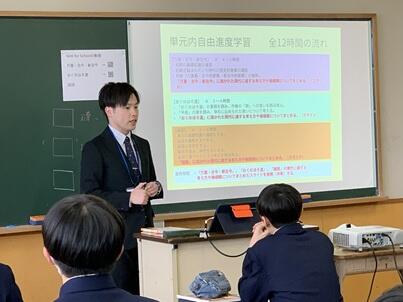 1年1組社会 参観者にも課題や進め方、生徒それぞれの今日の取組などを紹介