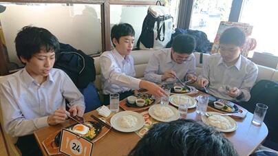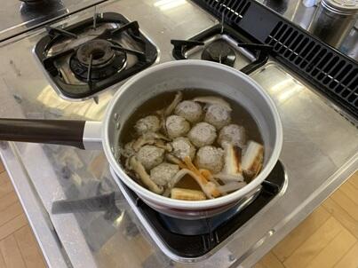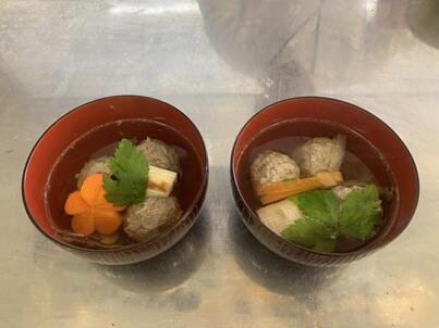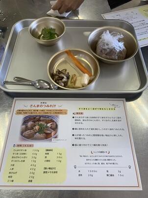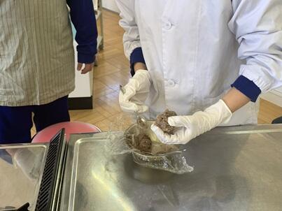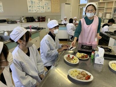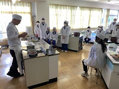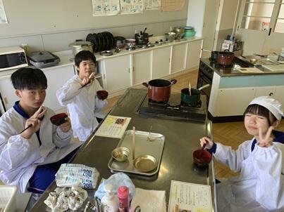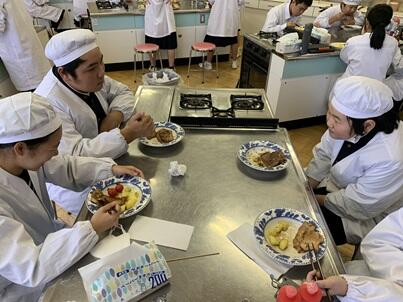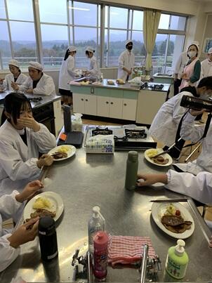 1階までいい香りが届いていたので見に行くと、実習を終えて、写真撮影し、いただきますをしているところでした。どの班も上手に作っていました。