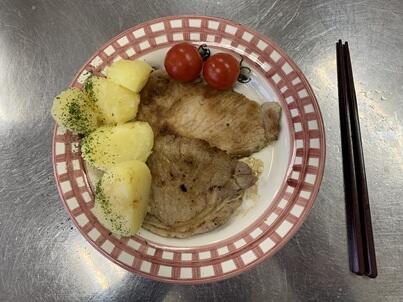 今日の調理は 豚の生姜焼き、粉ふきいも、ミニトマト添え