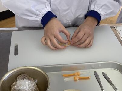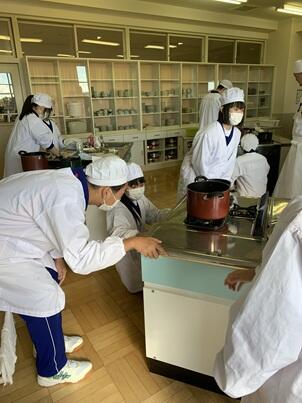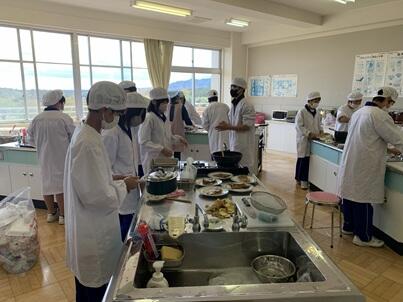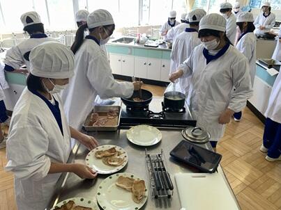 2、3校時、1年1組は、3階の調理室で調理実習を行いました。