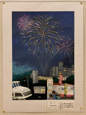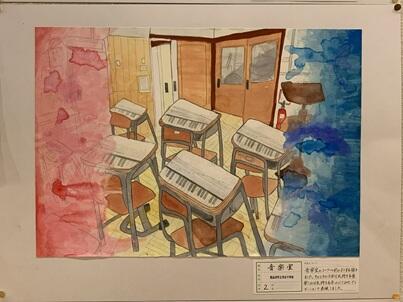 木村さんは、8歳のとき、広島で被爆しました。持ち込んでいただいた絵を掲げながら、幼い頃、原子爆弾による熱線でただれたお祖父さまの膿んだ皮膚からウジムシを取った話などをしてくださいました。
