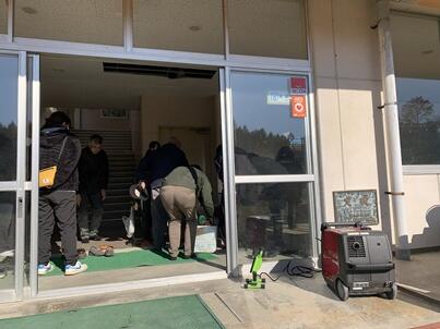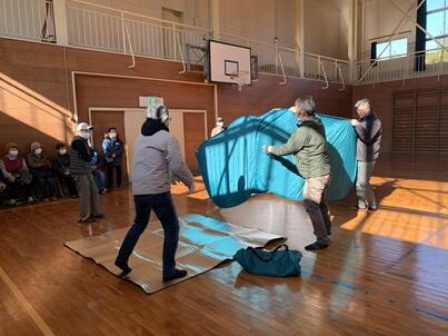 松岡タウンセンターに避難後は、名簿作成、消火訓練、防災資機材(担架・軽量リヤカー組立・発電機)稼働訓練を行いました。