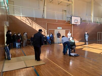 地区での訓練は3年目になります。1年目は地区の方々で、2年目学校も一緒になって小学生・中学生も参加しました。