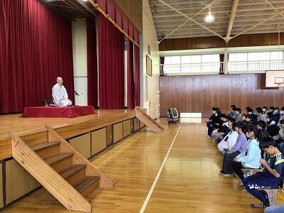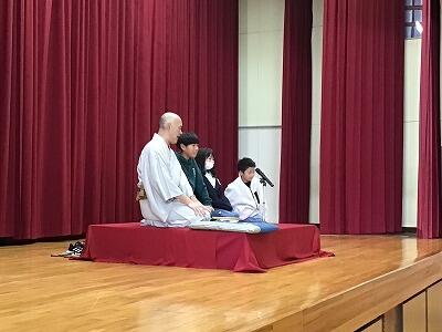 途中では、児童3人が舞台に上がり、禽太夫さんの指導のもと、短い小噺に挑戦しました。緊張しながらも堂々と演じる姿に、会場から大きな拍手が送られました。