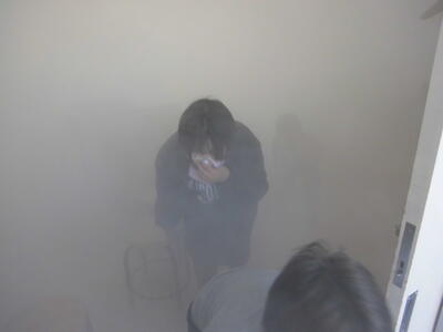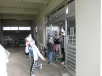 その後、全校児童が学年ごとに煙体験を行いました。煙を吸い込まないようにハンカチや袖で口元を覆い、姿勢を低くして避難することの大切さを学びました。実際に体験することで、より現実的に避難行動を考えることができました。
