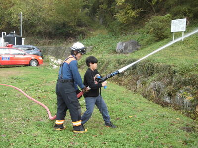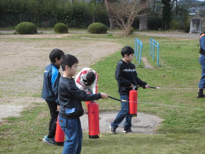 また、4年生は少年消防団として、校庭で消火器の使い方や消防車のホースを使った放水体験にも挑戦しました。水の勢いが強く、ホースを固定するのが大変だったという感想も聞かれ、貴重な体験を通して防火への意識を高めることができました。